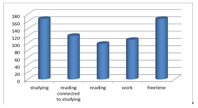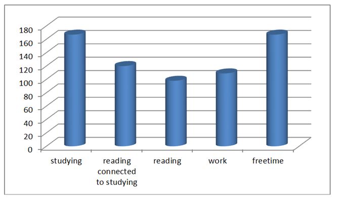 The groups formed based on the index of economic capital influenced the time of study-related reading (ANOVA-test, p0.05, sig.: 0.035). The higher the supply of durable consumer goods was, the lower was the estimated length of time spent on study-related reading (poorly supplied group: 135 minutes, satisfactorily supplied group: 113 minutes, well supplied group: 106 minutes). Our previous research evidenced that favourable financial situation has a negative effect on students’ reading activity (Bocsi, 2013). Thus the student group that organically incorporates reading into their lifestyle seems to come from disadvantaged strata.