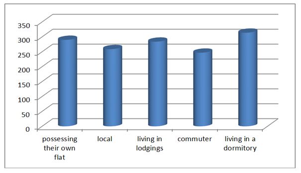 The variable of temporary place of residence (students living in a dormitory, commuting, living in sublets, local students, students owning a flat) influenced the length of time spent with studying as well as the cumulative figures. The ranges of time spent with studying were the highest in the case of students living in a dormitory (196 minutes), local students (160 minutes) and those living in sublets (150 minutes) represented intermediate values, while the timeframe of commuting students (142 minutes) and those owning a flat (120 minutes) was lower (ANOVA-test, p0.05, sig.: 0.06). The cumulative values are illustrated in Graph 3. Therefore it can be stated that commuting restricts time ranges spent with studying. But commuting students are forced to abandon other activities as well: their estimated daily free/leisure time is approximately 40 minutes less than the sample average.