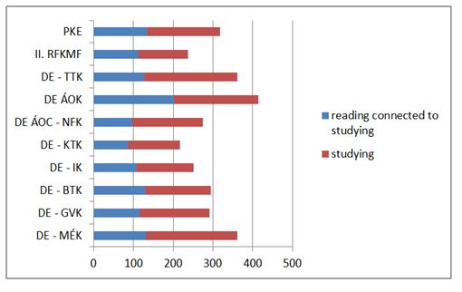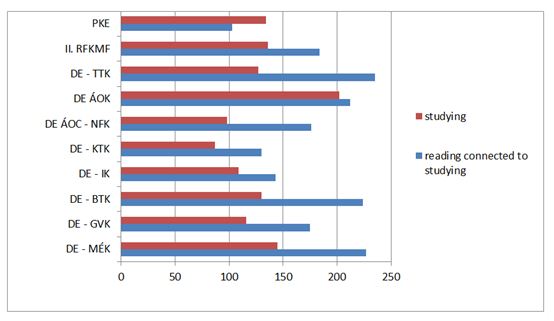 Nevertheless, if we analyze only studying and the time spent with studying by means of ANOVA test, significant relation can be found (Graph 5). There are rather serious differences: in the case of PKE students for instance, the range of time spent with study-related reading exceed the time spent with studying, while in the case of medical students (DE ÁOK), both studying and study-related reading are highly valued. In accordance with our previous surveys, it can be stated that in the case of DE KTK, students are not only doing less ‘informal’ reading, but also use less books related to their studies. It is worth highlighting that we found similar patterns in the case of DE BTK and DE TTK students as well.