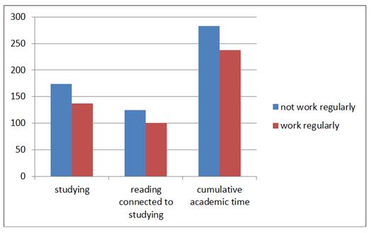 We presumed that student employment which has become an important element of student lifestyle in the past two decades would reduce the time spent on studying. Based on the TERD database, this relation seems to be significant also in the sample from Partium, thus it both reduces academic time as a whole and its elements too (Graph 6). The differences are approximately half an hour and an hour on average. However, it cannot be explained merely with quantitative methods whether this decrease signifies a more effective way to organize studies and rationalize them or that employment decreases study efficiency.